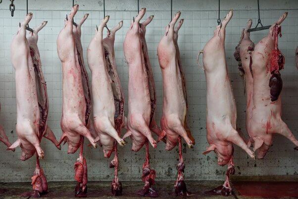 In the Photo: Pigs Hanging at a Slaughterhouse / Photo Credit: PETA