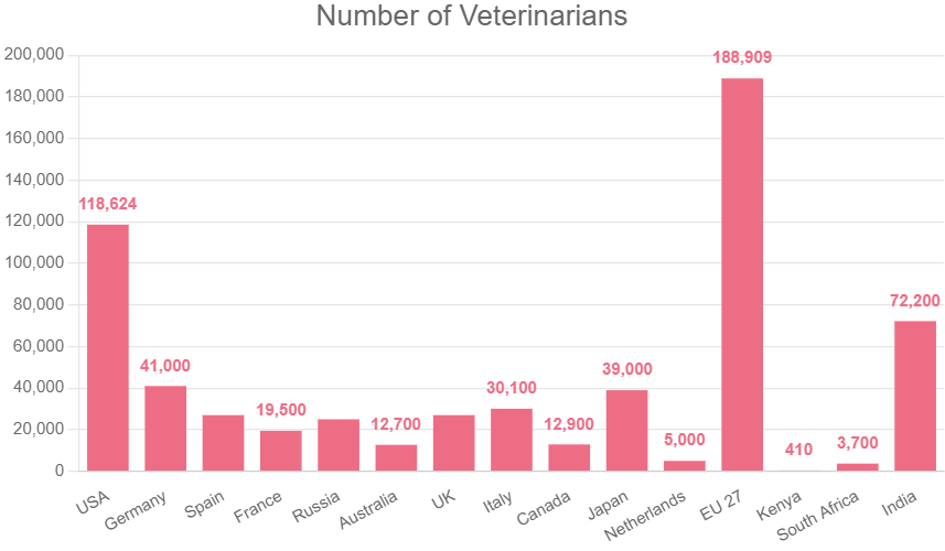 There are about 600,000 veterinarians globally, and they are unevenly distributed. Fewest are found in the agricultural areas of developing countries, the most are working in urban settings in the developed world.
