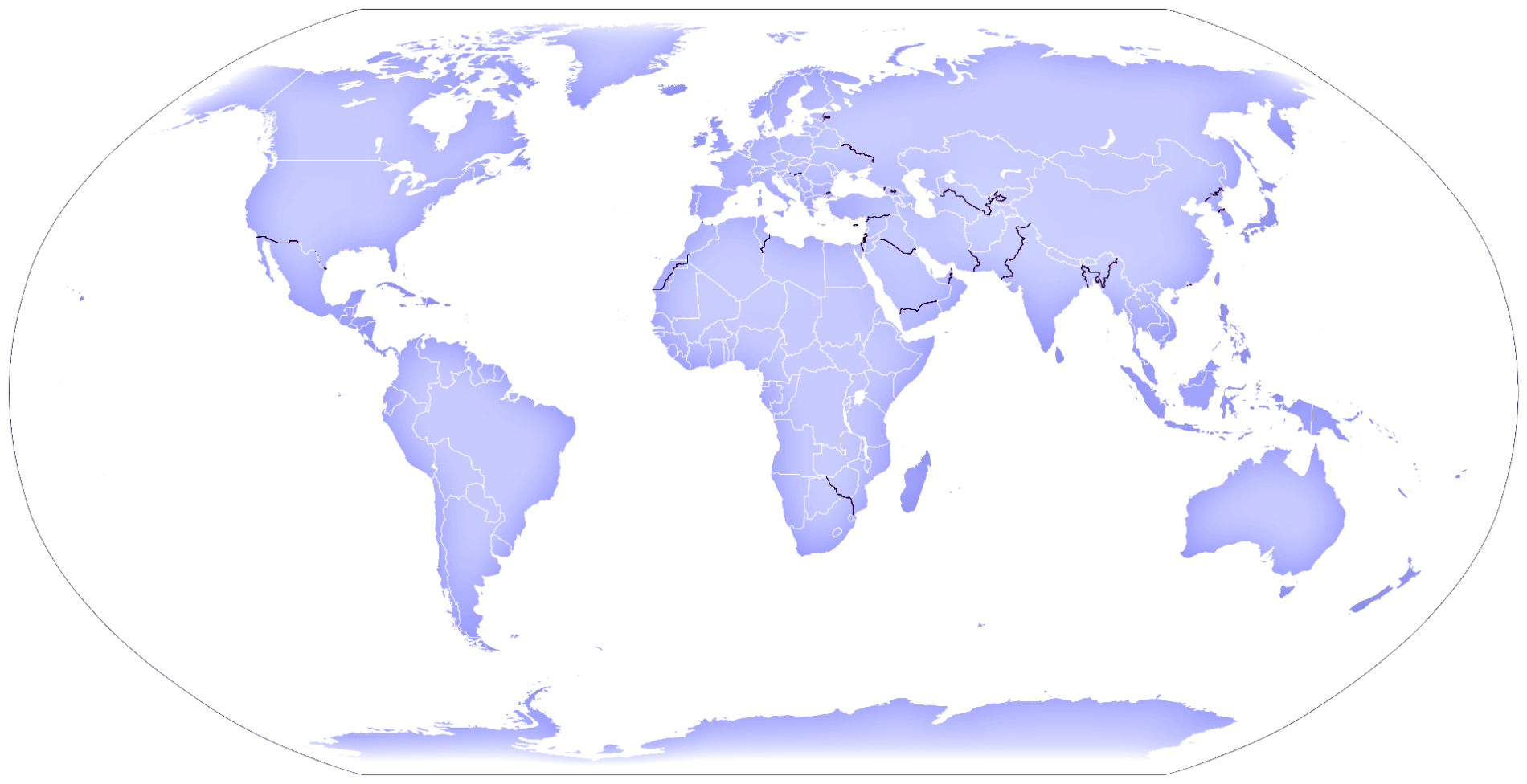 Map of separation barriers in the world. The exact status of many barriers is unknown (length completed, etc), but also the number of barriers. Date: April 2013. Source: Wikimedia commons