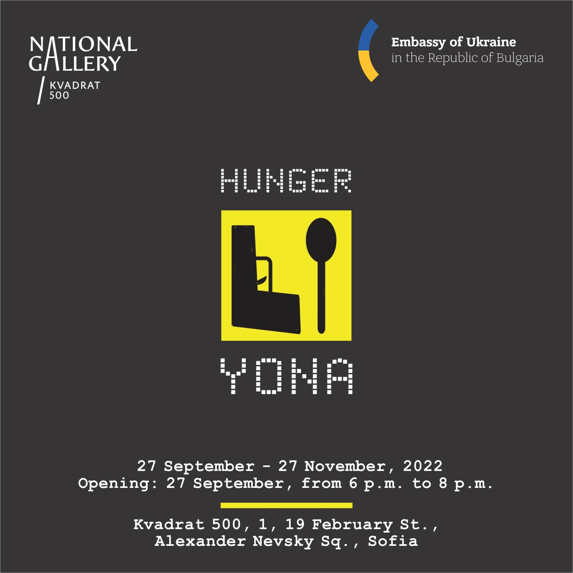Having finally negotiated the guaranteed opening of her exhibition in September of 2022 with the support of the Ukrainian Embassy in Sofia, Yona had her gallery banner unexpectedly taken off the main entrance of “Kvadrat 500” and placed in a poorly visible corner outside the main gates – not even a full month after the launch of “Hunger”.