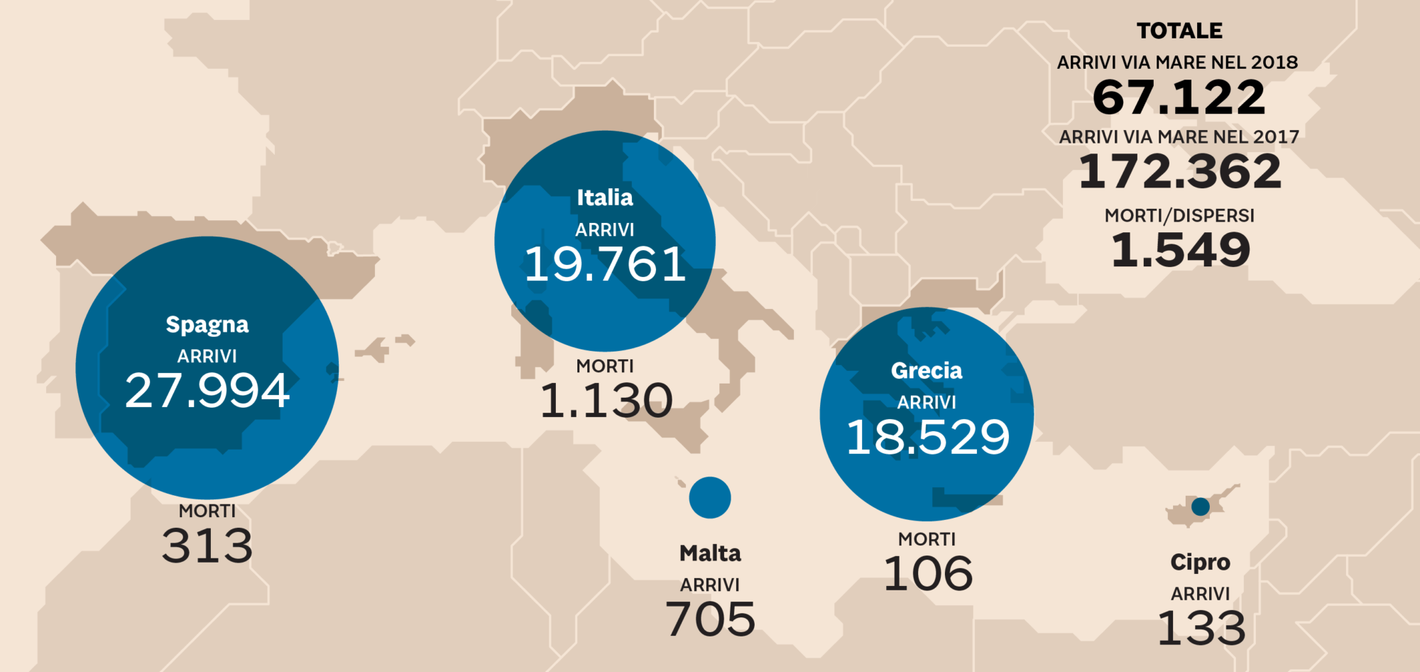 Consider this diagram showing immigrants arrivals to Europe in 2018 (UN data) that was published by the Sole 24 Ore in Italy (disclosure: I am stationed in Rome), another country convulsed with sudden hatred for immigrants now that Matteo Salvini, the populist leader of the far-right League has become Minister of the Interior in the new government:
