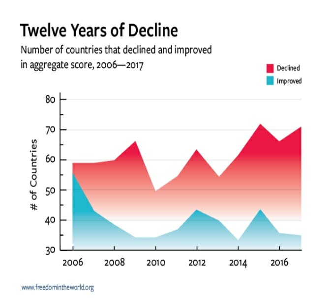 Her query and associated concerns about America’s path toward protectionism and isolationism are also germane to the future of democracy which now also finds itself in peril globally, according to Freedom House, a non-partisan Washington think tank [5]. Their annual survey findings [6], as shown in Figures 6.1 and 6.2, echoed by the European Council Foreign Relations [7], Human Rights Watch [8] and The Economist Intelligence Unit [9] confirmed that countries where democracy declined (e.g., ‘right to choose leaders in free and fair elections, freedom of the press and the rule of law) outnumbered those that gained, and that there was a drop in the percentage of free countries. Continuing down the road of protectionism, as ‘the inter-war years should have demonstrated beyond doubt,’ can lead not only to undermining economic progress, threaten democracy but also precipitate ‘all-out global conflict, as ‘the parallels with 1914 are stark.’ [5]