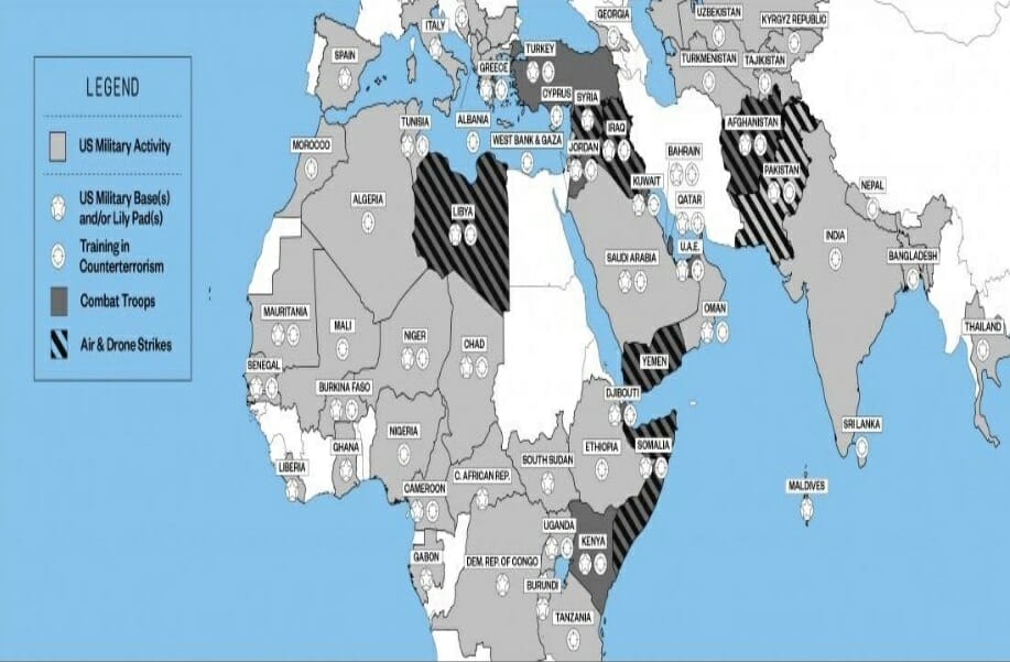 As indicated on the graph, other major conflicts involving the US have been the Korean War (1950-1953) and the Viet Nam War (1955-75) with estimated deaths at around 47,000 and 34,000, respectively. Beginning what is arguably known as the War on Terror, ‘the US-led war in Afghanistan was a response to the September 11, 2001, terrorist attacks on America – with total loss of life nearly 3000 – in which Coalition forces toppled the ruling Taliban in 2001.’ In his article “Mapping a World From Hell,” [15] Tom Engelhardt, a co-founder of the American Empire Project [17], ‘presents a unique map (Figure 6.4) that shows ‘an increasingly complex set of intertwined conflicts…stretching ‘from The Philippines through South Asia, Central Asia, the Middle East, North Africa and deep into West Africa…’