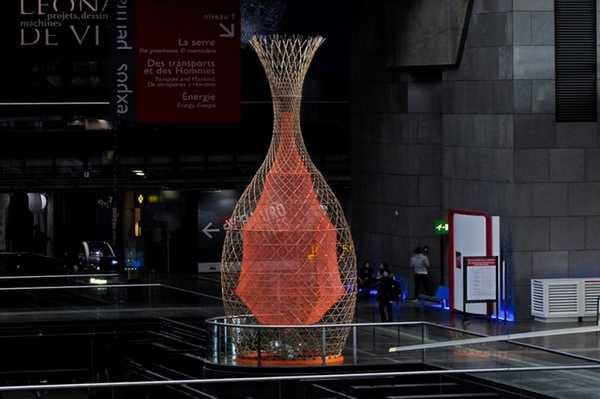 The tower is designed to collect water from the air and fog, but primarily from rainwater. When it rains, a permeable mesh, within the bamboo structure, allows air to pass through and captures the falling water droplets. The collector, a large funnel-shaped tube, sits below the mesh and stores the water droplets as they roll off. A smaller funnel filters the water from the collector to an 800-gallon water tank. The tower is expected to garner 13 to 26 gallons (50 to 100 liters) of water per day. People are able to retrieve this water by gathering at the base of the tower and pouring it out of a spigot.