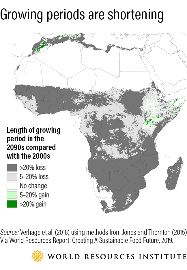 At the same time, growing seasons may become shorter in regions that are already vulnerable. As seen in the graph below, much of sub-Saharan Africa, the region with the largest share of the population at risk of hunger, is projected to experience a 20% reduction in the length of the growing period in 2090 compared to the 2000s. Climate change impacts like increased seasonal variability and warming temperatures disproportionally hurt poor communities reliant on rainfed agriculture. If the rains don’t come, they can’t farm.