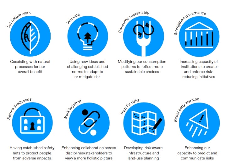 - Harnessing nature to reduce hazards: For example, “prescribed burning to prevent mega-fires (Mediterranean wildfires), restoring forest ecosystems to stabilize the soil and prevent land degradation (Haiti earthquake, Taiwan drought, Southern Madagascar food insecurity), or regenerating urban streams and rivers and applying risk-aware urban planning to reduce flood risk (Hurricane Ida).