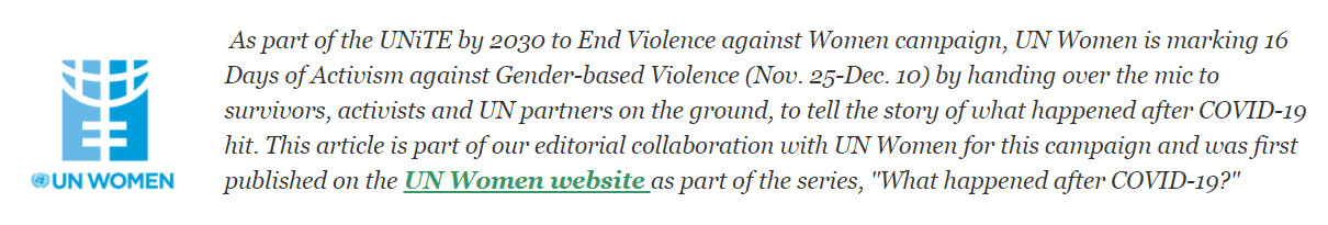 Even before the COVID-19 pandemic hit, 243 million women and girls globally were abused by their intimate partners in the past year. Since the pandemic, with lockdowns measures, countries around the world have seen an alarming rise in reporting on violence against women, especially domestic violence. UN Women is working with women on the front lines who are responding to the shadow pandemic of violence against women and girls every day. “What Happened after COVID-19 hit”, brings you some of their stories, and how their programmes are backing solutions that leave no one behind.