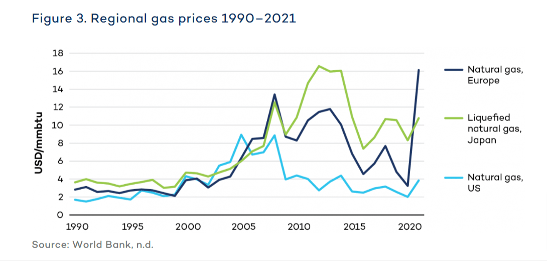 Despite occasional spikes, gas prices in the European and U.S. markets have historically been much lower than what we have seen in 2021 and 2022. Since 2000, gas prices have fluctuated between 2 and 12 USD/MBtu (see Figure 3), far lower than record high prices in 2022, which in Europe reached more than 50 USD/MBtu.