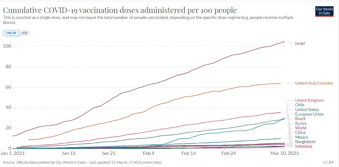 Looking at this list of countries, European citizens could be forgiven for feeling short-changed and made fun of. These are not poor, low-income countries part of the United Nations-sponsored COVAX roll-out. These are rich or fast-growing and emerging countries that in some cases are doing much better than the EU in getting the vaccines out to their citizens.