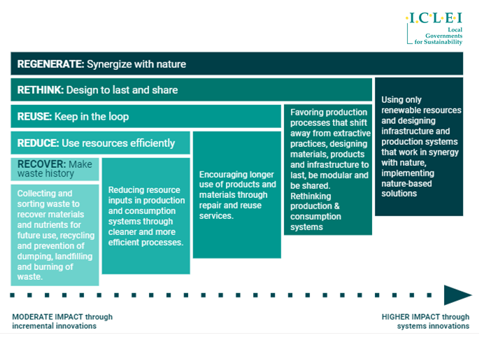 The circular economy is a tool to map opportunities to save resources and reduce waste across the value chain while fostering local economic development and social inclusion. It encourages decision makers to look for interventions as early in the value chain as possible – from the moment resource extraction is planned – and beyond their jurisdictional boundaries. ICLEI´s 5Rs framework offers a lens through which to plan circular economy interventions at the local level: