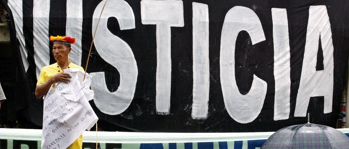 In the photo: A Secoya elder stands in front of a banner reading ‘Justice’ during a demonstration at the start of the trial against Chevron in Lago Agrio, Ecuador.