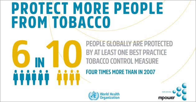 The latest WHO monitoring report (2017) found a dramatic increase in life-saving tobacco control policies over the last decade, with 4.7 billion people – 63% of world’s population – now covered by policies such as strong graphic warnings, smoke-free public places, and other measures.
