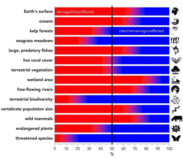 The red color in the above diagram is a striking visual warning of the extent of the damage to our biosphere. No area has escaped, and the greatest damage proportionately has been wrought to wetland areas and free-flowing rivers, both worse off than the oceans that are certainly not doing well.