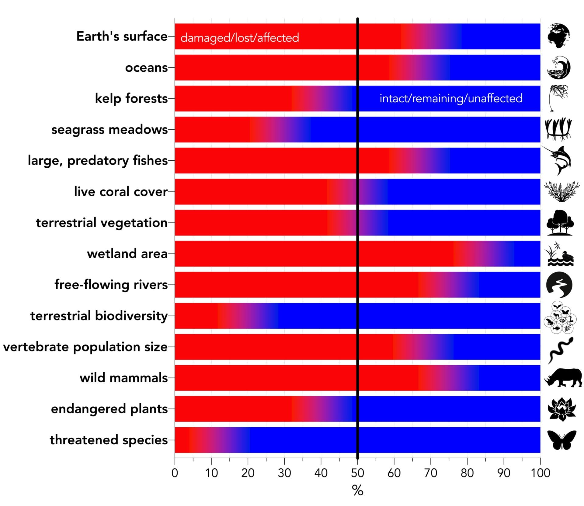 Freshwater and marine environments have also been severely damaged. More than two-thirds of the oceans have been compromised to some extent by human activities, live coral cover on reefs has halved in less than 200 years, kelp forests have declined by some 40%, and the biomass of large predatory fishes is now less than a third of what it was only 100 years ago.