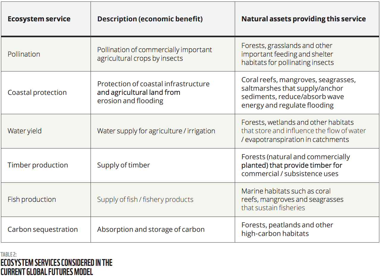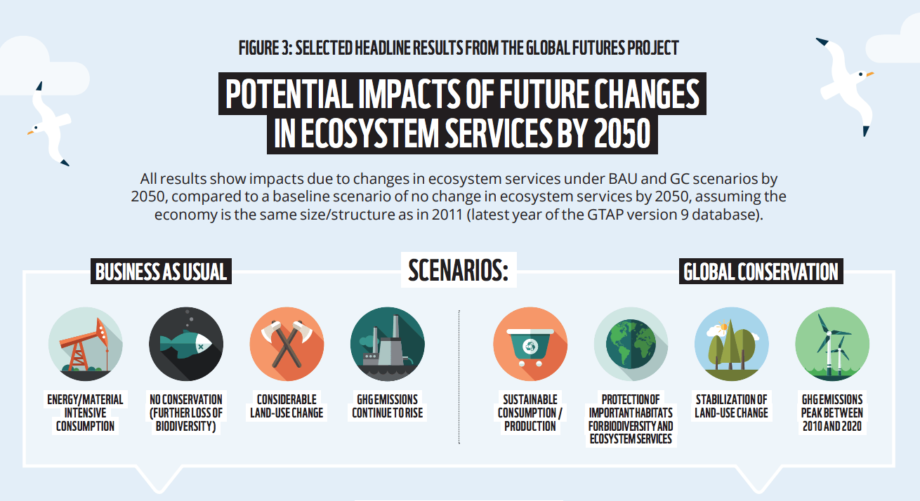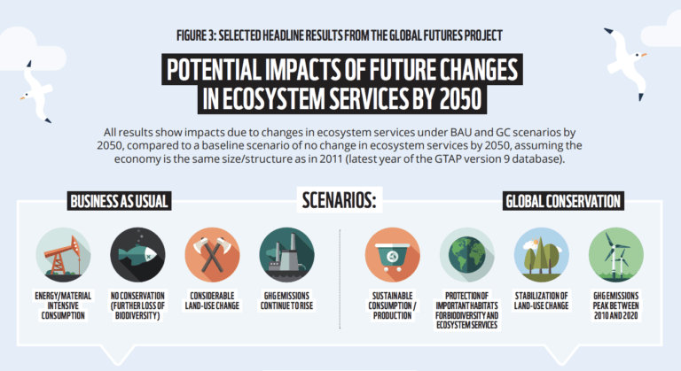 To estimate economic impact, “Global Futures” considered the relationship of ecosystem services to economic outcomes such as GDP, trade, production, and commodity prices.