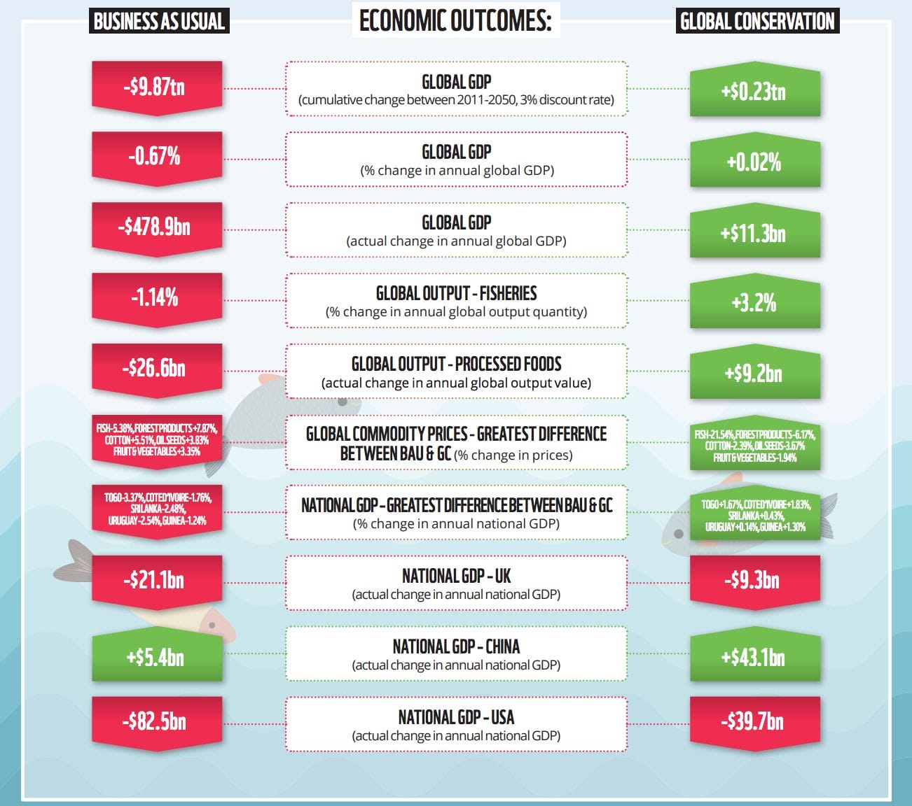 If the world takes action to avoid the business-as-usual scenario, on the other hand, and if targeted environmental changes defined in the Global Conservation scenario are implemented, the study foresees global GDP rising by 0.02% (US$11 billion) per year.