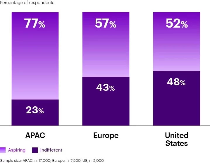 Despite this significant new pool of jobs, it will still not be enough to meet the demands of the Youth. This is especially problematic in the Asia Pacific region where the aspiration to work in green industries is strikingly higher than in Europe and the US, as shown by the graph below. There, the green transition over the next decade will require far more jobs to be created than the market will be able to provide.